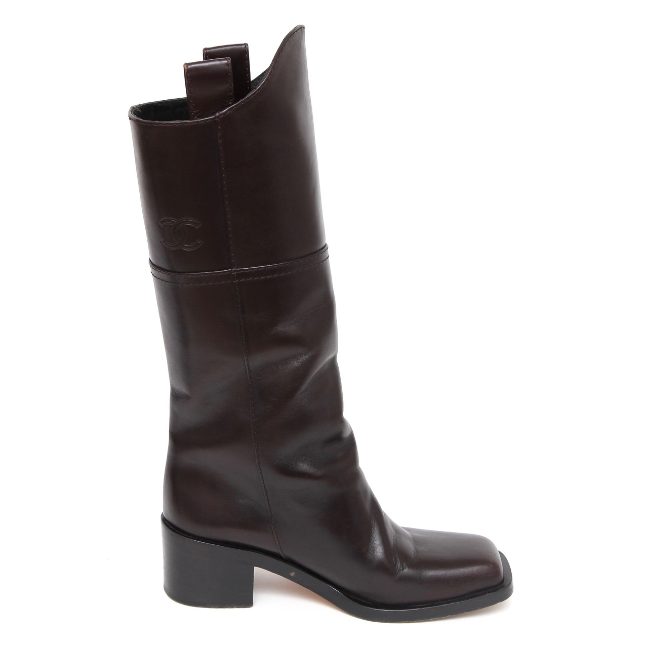 Chanel Brown Leather Knee High Riding Boot Heel Pull On Square Toe Leprix